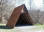 Das Problem ist inzwischen behoben, die Hütte lädt wieder zum Verweilen auch bei Regenwetter ein. In unmittelbarer Nähe weist ein Hinweisschild auf lohnenswerte Ziele in der Umgebung hin. So gelangt man von hier aus beispielsweise durch