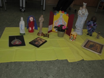 Für den nächsten Tag wurde ein Marienaltar im Atelier errichtet. Diesen konnten die Kita-Kinder für den Rest des Monats noch mit frischen Blumen schmücken. Einige Kinder brachten sogar bunte Blumen und Kerzen für den Altar mit, der an jedem Morgen für viele die erste Anlaufstelle war.