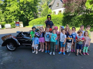 Zu dieser Sommerspass-Aktion war es laut Angaben der Kita ganz spontan gekommen. Immer dann, wenn Klappert, der Mitarbeiter der Kreispolizeibehörde Siegen-Wittgenstein ist, mit seinem Motorradgespann an der Kita vorbeifuhr, riefen die Kinder „Hurra, Hurra".