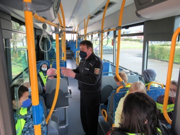 Werner Eichelhardt zeigte den Kindern Schritt für Schritt, wie man sich richtig verhält wenn man Bus fährt, welche Gefahren es dabei gibt und wie man diese vermeiden kann. Dabei konnten die Kinder ihr bereits gelerntes Wissen aus dem Vorschultreff unter Beweis stellen. Sie übten, wie man sicher auf den Bus wartet, wo man sich im Bus hinsetzt, wie man sicher im Bus stehen kann und wie man unfallfrei wieder aussteigt.