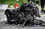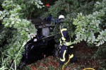 Sörth/Giesenhausen. Zu dem Verkehrsunfall wurden die freiwilligen Feuerwehren Altenkirchen und Neitersen alarmiert. Die ersten eintreffenden Kräfte bestätigten die Information, dass eine Person eingeklemmt sei. An der Unfallstelle zeigte sich, dass große Kräfte gewirkt haben mussten. Der Motor eines beteiligten Fahrzeugs (Audi) wurde herausgeschleudert. Der zweite PKW (BMW) landete unterhalb der Straße. Hier befindet sich, in Richtung Bahnstrecke, eine Böschung und ein Waldstück. Durch diese Lage gestaltete sich die Rettung der Person schwierig.