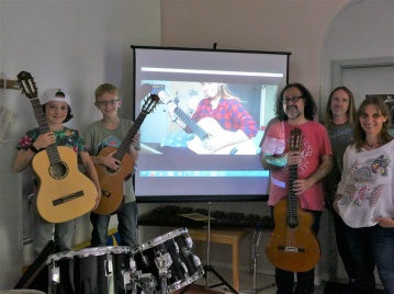 Die teilnehmenden Schüler in zwei Gruppen in den Räumen der Musikschule „Musiqspace“ in Schönstein des Musikwissenschaftlers Stefan Quast, der in der Eduardo als Gitarrenlehrer tätig ist und mit der schon länger Verbindung zur Musikschule in Chile besteht, nahmen am letzten Dienstag während des Unterrichts ein kleines, auf der Gitarre gespieltes Musikstück auf Video auf und stellten die Räumlichkeiten und natürlich sich selbst kurz vor. Beim Zoom-Meeting am Folgetag erfuhren die Teilnehmer einiges über die Musikschule in Chile und konnten den chilenischen Schülern Fragen stellen, die per Video nach Chile auf die virtuelle Reise gingen.