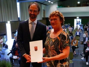 Es schlossen sich die Grußworte des Ersten Beigeordneten des Landkreises Altenkirchen, Tobias Gerhardus, des Bürgermeisters der Stadt und der Verbandsgemeinde Kirchen, Andreas Hundhausen, stellvertretend auch für die Stadt Betzdorf und die Verbandsgemeinde Betzdorf-Gebhardshain, der Schulleiterkollegen der Region, gesprochen von Katja Weidt, des Linzer Schulleiters Thomas Schmacke und der Vorsitzenden der Fachschaft Deutsch, Sigrid Fielauf, an. Gerhardus betonte Berg-Bronnerts vielseitige pädagogische und organisatorische Talente, verwies ebenso wie Löcherbach und Wertebach auf das herzhafte Lachen und dankte für die gute konstruktive Zusammenarbeit. Katja Weidt, Schulleiterin des Wissener Gymnasiums, nahm das Logo der IGS Betzdorf-Kirchen, eine ausgestreckte Hand, in der sich etwas Pflanzerde und eine junge Pflanze befinden, zum Anlass, um Berg-Bronnerts Haltung gegenüber Menschen, Tieren sowie Pflanzen, vor allem aber gegenüber ihren Schülern, ihrer Leidenschaft für den Beruf sowie ihre Teamfähigkeit darzustellen. Damit gehe, so Weidt, „ein echter Typ“.