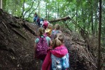 Bevor es losging wurde noch einmal auf die Waldregeln aufmerksam gemacht. Danach erfolgte die erste Aufgabe für die Kinder: „Ausschau halten nach dem ersten Objekt auf dem Weg.“ Es war ein großer Holzadler. Adler beobachten den Wald von oben und sehen somit welche Tiere dort leben. Das war auch die nächste Frage an die Kinder: „Welche Tiere, außer dem Adler, leben sonst noch im Wald“? Mit Adleraugen gingen die Kinder auf Spurensuche und haben selbst die Allerkleinsten Lebewesen entdeckt. Über ihre Sinne konnten sie die Vielfältigkeit des Waldes wahrnehmen. Es gab vieles zu hören, zu sehen und zu riechen. Um weitere Figuren zu finden, mussten die Kinder enge Pfade, Bäche und wurzelreiches Gelände überqueren. Eine Riesenspinne aus Holz war verlockend für eine Kletterpartie.