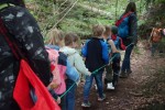 Natürlich gehört zu einer Wanderung auch eine Rast, bei der man sich mit Essen und Trinken für die nächsten Aufgaben stärken kann. Später ging es dann, geführt an einem langen Seil, einen schmalen Pfad entlang. Hier war äußerste Konzentration angesagt. Ganz leise und aufmerksam sollten die Kinder schauen, welche Gegenstände am Rand versteckt sind, die nicht in den Wald gehören. Das Ergebnis war erstaunlich. Auf dem weiteren Weg begegneten die Kinder noch anderen außergewöhnlichen Figuren, die sie faszinierten und zu abenteuerlichen Erzählungen anregten. Bei der letzten Station, einem Ritter, fanden dann noch Geschicklichkeitsspiele, wie Tannenzapfenlauf-und Zapfenweitwurf statt. Danach erfolgte der Weg zurück zum Ausgangspunkt. Für alle stand fest, es war ein erlebnisreicher Ausflug.