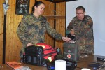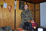Alina, eine Zeitsoldatin, nahm ebenfalls am Biwak teil. Sie ist ausgebildete Rettungssanitäterin, hat sich bei der Bundeswehr verpflichtet und studiert zurzeit in Mainz Human-Medizin. Nach Beendigung des Studiums wird sie zur Truppe stoßen und dort im Sanitätswesen arbeiten. Alina führte anhand eines Rettungskoffers den interessierten Reservisten noch einmal einen Schnellkurs in Erste Hilfe–Maßnahmen vor. Dabei konnten die Reservisten ihre Grundkenntnisse auffrischen, was sehr hilfreich sein kann, da überall und jederzeit Unfälle geschehen können.