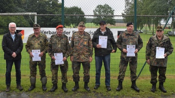 Die Geehrten sind: Klaus-Dieter Wolff (15 Jahre Mitglied), Jens Boehlke (20 Jahre), Achim Friedrich (30 Jahre), Frank Becker (35 Jahre), Klaus Weihrauch und Wolfgang Erdmann (beide je 50 Jahre). Den beiden Jubilaren Weihrauch und Erdmann verlieh Klaus Grollius zusätzlich zur Urkunde noch die goldene Ehrennadel des Reservistenverbandes.