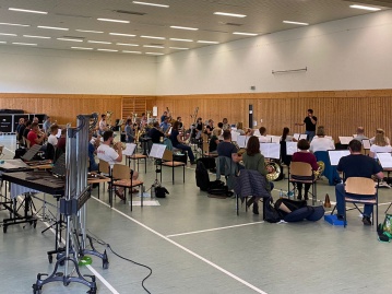 Ein Highlight gegen Ende der Probe war das erste Anspielen der eigens für die Bläserphilharmonie komponierten Ouvertüre von Otto M. Schwarz. Noch nie erklang dieses Werk und die Anspannung war groß. Wie das Werk klingt, will das Orchester noch nicht verraten denn das Gründungskonzert am 3. Oktober 2021 startet mit der Weltpremiere der Ouvertüre, die den Namen Symphonic Dimensions trägt und der Bläserphilharmonie im Kreis Altenkirchen gewidmet ist.