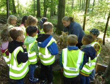 Von dort ging es in den Wald, um in einem vorab vorbereiteten Waldstück nach weggeworfenem Müll Ausschau zu halten. Anschließend wurde besprochen wie lange die verschiedenen Materialien brauchen bis sie abgebaut sind. Es folgten einige Bewegungsspiele und die Kinder erfuhren einiges über die Waldmaus und den Fuchs. Diese Informationen wurden durch präparierte Tiere, die die Mitarbeiterinnen des NABU Altenkirchen dabei hatten, verdeutlicht.