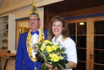 Aber der Noll betonte auch: „Ab heute ‚jeht et widder loss‘.“ Es sei nun möglich, die Prinzessin standesgemäß zu verabschieden und einen Prinzen proklamieren. In seinen Abschiedsworten an die scheidende Prinzessin ging Noll auf die Corona-bedingte Besonderheit ihrer Regentschaft ein: „Liebe Sylvia, nun ist es soweit, Deine lange Amtszeit endet heute. Nach dem Aschermittwoch warst Du für 604 Tage unsere Prinzessin. Das war die längste Amtszeit, die es bei den Burggrafen je gab. Für Deine Hofdamen Svenja Becker und Beate Steckel gilt das gleiche.“ Zum Dank gab es für die Prinzessin, die Hofdamen und den Hofstaat ein vielstimmiges dreifaches Alaaf. Vom Vorsitzenden Holger Becker erhielt sie einen Blumenstrauß. Die scheidende Prinzessin dankte allen Mitgliedern für die tolle Unterstützung. Die Wehmut, dass sie nun aus dem Amt scheiden musste, war ihr deutlich anzumerken.