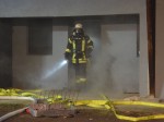 Für die Alarmübung waren die Stallungen ordentlich vernebelt. Auf den Knien kriechend erkundeten Atemschutzträger die Boxen, um die vermissten Personen zu retten. Hierfür hatte Elster, der viel Zeit in die Vorbereitung der Übung gesteckt hatte, wie Bläser herausstellte, seine eigene Familie aktiviert. Elsters Ehefrau Jennifer, Tochter Emelie und Sohn Oskar spielten die Vermissten. Rasch waren sie gefunden, auch mit der wertvollen Unterstützung der Wärmebildkamera. Die Drei wurden von den Atemschutzträgern ins Freie in Sicherheit gebracht.