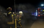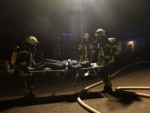 Für die Alarmübung waren die Stallungen ordentlich vernebelt. Auf den Knien kriechend erkundeten Atemschutzträger die Boxen, um die vermissten Personen zu retten. Hierfür hatte Elster, der viel Zeit in die Vorbereitung der Übung gesteckt hatte, wie Bläser herausstellte, seine eigene Familie aktiviert. Elsters Ehefrau Jennifer, Tochter Emelie und Sohn Oskar spielten die Vermissten. Rasch waren sie gefunden, auch mit der wertvollen Unterstützung der Wärmebildkamera. Die Drei wurden von den Atemschutzträgern ins Freie in Sicherheit gebracht.