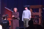 „Wo bin ich“, fragt Luther, als er probeweise die VR-Brille aufgesetzt hat und meinte: „Das ist Zauberei.“ Aber dann ist er doch begeistert, weil er „Herr Stephan“ erläutert, dass man damit die Menschen überall zu jeder Zeit mit den Botschaften erreichen kann. Die virtuelle Realität als Verpackung für den guten Inhalt, wie auch schon bei dem gedruckten Papier. Frau Heinrich, die als Gönnerin Luther die Taler für die Druckaufträge in die Hand drückt, kann er diese virtuelle Realität gar nicht schmackhaft machen. „Wir können unsere Botschaft zu jeder Zeit zu den Menschen nach Hause bringen“, schwärmt Luther. „Dann kommen die Leute gar nicht mehr zu uns“: Frau Heinrich winkt gleich ab, denn nach ihren Vorstellungen, sollen die Menschen in die Kirche kommen, „die ein heiliger Ort“ sei. Während Frau Heinrich, von Ramona Hebel gespielt, schon zu ihrer nächsten Verpflichtung davoneilt, ruft ein perplexer Luther hinterher, der die Argumentation seiner Unterstützerin so gar nicht nachvollziehen kann: „Frau Heinrich, ich dachte, wir hätten eine Mission, eine Botschaft. Einen Auftrag.“
