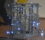 Diesmal sind es etwas weniger Laternen als 2020. Deshalb ist auch nur eine Hälfte der Schaufenster für den stehenden Zug in Beschlag. Aber: Die anderen Scheiben sind deshalb keineswegs trist. Nadine Linke hatte die Silhouette von Betzdorf mit markanten Gebäuden und Straßenzügen auf Wellpappe gemalt. Diese sind an einem Schaufenster umlaufen angebracht und teils von innen beleuchtet. Die evangelische Kreuzkirche und die Pfarrkirche St. Ignatius sind so entstanden, und der Rampenwendel in der Fußgängerzone hat so den Weg an die Viktoriastraße gefunden. Für Letzteres hat der Volksmund ja schon lange einen eigenen Namen geprägt: Elefantenklo. Und siehe da, Nadine Linke hat einen Dickhäuter auf die Spitze des Rampenwendels gemalt. Bei dem Pressegespräch wurde hervorgehoben, dass die ungenutzten Schaufenster ohne die Zeichenkunst von Linke anders, nicht so schön aussehen würden.