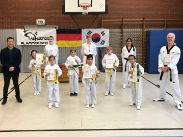 Oberlahr. Geprüft wurde in den folgenden Bereichen: 1-Schritt-Kampf (Hanbon Gyrugi), Formenlauf (Poomsae), traditionelle Techniklehre, Pratzentraining, Bruchtest (Kyok Pa) und Theorie. Alle Sportler bestanden in den genannten Disziplinen. Der lizensierte Prüfer Großmeister Mungyo Choi aus Bonn (7. Dan Taekwondo) nahm die Prüfung ab.