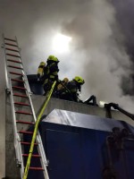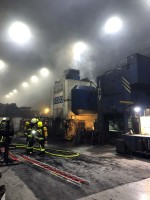 Zwei weitere Trupps, natürlich ebenfalls unter Atemschutz, bereiteten den Einsatz einer tragbaren Leiter an der Maschine vor. Zwei Einsatzkräfte gelangten über die Leiter in den oberen Bereich und konnten von dort die Maschine mit Schaum fluten. Weitere Kräfte öffneten die Seiten der Maschine, um auch hier die Flammen, ebenfalls mit Löschschaum, im Inneren zu ersticken. Nach dem Ablöschen des eigentlichen Brandherdes wurden noch Nachlöscharbeiten erforderlich. Die Freiwilligen Feuerwehren konnten, nach der Wiederherstellung der Einsatzbereitschaft, den Einsatz gegen 1.30 Uhr beenden.