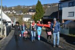 In der langen Zeit der pandemiebedingten Vakanz des Faschings habe man den Karnevalsruf vergessen, leitete die HCC-Gruppe in das Spiel ein. Nur einen Lückentext hatte man noch zusammen bekommen. Der war auf Transparenten notiert. Für die Teilnehmerinnen und Teilnehmer war es nun die Aufgabe, auf Zeit die bereit liegenden Worte in den Text einzufügen. Nachdem die Stoppuhr runtergelaufen war, wurde der vervollständigt Text laut gerufen. Natürlich samt der potenziellen Fehler. Auch hier kam Heiterkeit auf. Außerdem waren die Gruppen aufgerufen, noch etwas zu reimen, und zwar immer an die Zeilen der vorangegangenen Gruppe anknüpfend. Das alles kam bei allen gut an. Mit Kröbbelchen, Chips, Süßigkeiten und Getränken waren alle für den Weg versorgt worden. Auch die vorletzte Gruppe, die sich nachmittags los machte. Mit ihnen war an den Stationen neben dem HCC Ruf "schlöng ronner" auch "Nadda Jööh" zuhören. Unverkennbar: Das Quintett kam von der anderen Seite des "Köppels". Die Herdorfer Karnevalisten schmuzelten: Mit ihnen sei alles vertreten, Bollmichs, DJK, Domspatzen und Ex-Prinz der DJK.