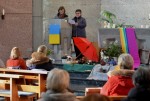 Anhand der biblischen Erzählung wurde im Gottesdienst verknüpft, "wenn Gott eingreift, wo man es sich nicht vorstellen kann". Es wurden die Schicksale von drei Frauen nacherzählt, die nach Misshandlungen durch den Ehemann, in der Situation von Armut und Hunger oder nach einer schweren Erkrankung ihre Begegnungen mit Gott machten. Dem Thema "Zukunftsplan Hoffnung" widmeten sich ev. Pfarrerin Karthäuser und die kath. Pastoralreferentin Ulrike Ferdinand an. Die Postkarte zum Weltgebetstag nahm sich Karthäuser vor. Ein Tor führt auf einen steinigen Weg mit einer Blume, darüber eine weiße Taube mit ihren schützenden Flügeln am blauen Himmel und ein Regenbogen. "Der Weg in ein unbekanntes Land kann losgehen", sagte sie. Anhand der Bildbeschreibung sprach die von der Hoffnung, dem Geist der Barmherzigkeit und des Friedens und Gottes Zeichen für seine Treue und Weisheit. "Geschichte wiederholt sind, leider, das wird uns drastisch bewusst", sagte Ferdinand, "und, dass wir den heiligen Geist brauchen." In England, Wales und Nordirland habe sich das Thema Flucht in die Geschichte eingebrannt. Es seien immer wieder Menschen hingeflüchtet, um ein neues Leben anzufangen. Flucht habe man auch "in den vergangenen Jahren erlebt, bis heute", sagte Ferdinand. Menschen würden sich auf den Weg machen, um beispielsweise Krieg zu entfliehen: "Aus einer Situation, die unwürdig und unmenschlich ist", sagte die Pastoralreferentin – und: "Es gibt Leute, die sich heute auf den Weg gemacht haben." Ferdinand sprach auch den "Zukunftplan Hoffnung" an. Leide könne man nicht verhindern, aber immer wieder ein kleines Zeichen der Solidarität setzen. Zum Beispiel, in dem Fliehende ein Stück Heimat finden, sagte Ferdinand: "Da wirken wir mit an Gottes Zukunftsplan."