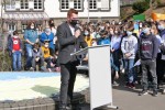 Schulleiter Uwe Mattusch übernahm die Begrüßung der Anwesenden: "Am Morgen bin ich an einem Supermarkt vorbeigekommen. Auf einer der Längswände stand: 'Stop the war in Ukraine and dont forget'. Auf einer Länge von 150 Meter waren eine Reihe von Ländern und Orten aufgezählt, in denen zurzeit Krieg herrscht, trotzdem reichte der Platz nicht." Was weltweit an Protesten die Menschen in ihrem Engagement gegen den Krieg verbinde, das wolle die Schule symbolisch nachstellen, indem sich die Schülergruppen an der Flagge treffen und damit Zusammenhalt gegen größtes Unrecht und Menschenverachtung zeigten, so Mattusch.