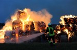 Schürdt. Die Leitstelle Montabaur alarmierte am Freitag (29. April), gegen 20.30 Uhr die freiwilligen Feuerwehren Flammersfeld und Neitersen. Parallel wurde das Tanklöschfahrzeug (TLF 3000) aus Weyerbusch alarmiert. Dieses Fahrzeug verfügt mit rund 3.000 Litern über einen großen Wasservorrat. 30 Rundballen brannten – ein solches Feuer sei kaum zu löschen, so der Wehrleiter Björn Stürz. Denn: "Es wäre eine enormer Wassereinsatz erforderlich und der Erfolg ist dabei selten gegeben." Die gestapelten Ballen lagen auf der Wiese, weit ab von Bebauung und auch nicht am Waldrand. Mit mehreren Strahlrohren wurde die Umgebung des Brandortes nass gehalten, um zu verhindern, dass das Gras sich entzünden konnte. Ein in der Nähe stehender Strommast war nicht gefährdet.