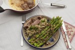 Die kurze Spargelzeit bis 24. Juni muss man nutzen für schnelle und feine Gerichte mit dem edlen Gemüse. Grüner Spargel ist geschmacksintensiver als der weiße, da er dem Wildgemüse ähnlich ist. Der leicht nussige Geschmack der Stangen wird durch eine nussige Vinaigrette und Haselnuss-Grieß betont.