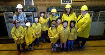 Zuerst ging es in die Kleiderkammer. Dort wurden die Kleinen erst einmal mit Schutzhelmen und gelben "Friesennerzen" ausgestattet. Denn von den feuchten Wänden im Berg tropft manchmal das Wasser und die Gänge können eng sein, sodass man sich stoßen könnte.