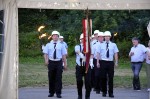 Weitere Grußworte gab es dann von der Vertreterin des Landkreises sowie der Bürgermeisterin der Verbandsgemeinde Hachenburg Gabriele Greis. Ortsbürgermeisterin Christa Hülpüsch bat dann noch die Vertreterinnen der Kirchen und einen Vertreter aller Bürgermeister der umliegenden Gemeinden um ein Grußwort. Nachdem Jens Geimer von der Hachenburger Brauerei gratuliert hatte, bildete den Abschluss Stefan Löhr als Vertreter der Ortsvereine. Selbstverständlich hatte jeder Festredner auch ein Geschenk dabei. Das Präsent der umliegenden Gemeinden ist eine Ruhebank, die mit den Daten des Ortes beschriftet wurde. Nach einer Pause, die durch die Burgkapelle Hartenfels musikalisch überbrückt wurde, warf Großes seine Schatten voraus. Für alle Anwesenden war zu erkennen, dass sich etwas Besonderes anbahnte. Die Feuerwehrleute aus Mudenbach, unterstützt durch Kameraden aus den umliegenden Gemeinden, bereiteten sich für den großen Zapfenstreich vor. In einer sehr stimmungsvollen und würdigen Atmosphäre führten die Blauröcke den Zapfenstreich, gemeinsam mit der Burgkapelle Hartenfels, durch.