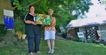 Die Werke von zwei Künstlerinnen waren an diesem Tag im Garten zu sehen. Für Petra Althof-Heumann ist das Malen seit Jahrzehnten ein wichtiger Teil ihres Lebens. Zeichnen und Malen erde sie und helfe ihr dabei, Gedanken und Gefühle zu sortieren. Sie widmet sich außerdem der Kunst der Enkaustik. Hierbei werden in Wachs gebundene Farbpigmente heiß auf den Maluntergrund aufgetragen, um ungewöhnliche Kunstwerke zu schaffen.