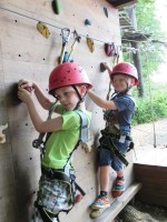 Alle hatten dies nach ein paar Versuchen schnell verinnerlicht und so konnte der Kletterspaß mit der nötigen Sicherheit losgehen. Ein besonderes Highlight war die Seilrutsche "Flitzi". Mit Schwung und viel Tempo ging es von Baum zu Baum, die Kinder fühlten sich dabei wie Tarzan und nicht selten erklangen dabei mutige Freudenschreie, dem ursprünglichen Tarzan-Schrei nicht unähnlich. Danach ging es noch in den Wildpark zum Tierefüttern. Besonders hungrig waren die Ziegen. Ungestüm fraßen sie das Futter den Kindern aus den Händen.