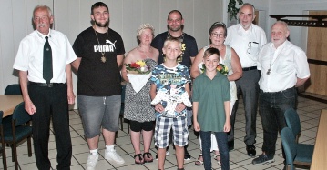 Gegen 17.30 traten dann die Aspiranten um den Titel Schützenkönig an. Auch deren Zielobjekt in Form eines hölzernen Vogels hatte in bewährter Weise Schützenbruder Peter Wagner gebaut. Anfangs nahmen zwölf Anwärter den 25 Meter entfernten Aar aufs Korn. Kurz nach 19 Uhr waren noch zwei Frauen und drei Männer übrig. Ab 20.10 Uhr wackelte der Vogel nach jedem Treffer verdächtig an der Befestigungsschraube hin und her. Wann er aber endgültig fallen würde, darüber gab es lebhafte Debatten im Schützenhaus. Nur 20 Minuten später war es soweit: Peter Bönkendorf bewies die größte Treffsicherheit und zerlegte den Vogelrumpf mit dem 404. Schuss in zwei Teile. Zuvor hatte er schon den rechten Vogel erwischt, Tilo Klöckner das Gegenstück auf der anderen Seite. Gebhard Nauroth konnte Reichsapfel und Zepter für sich verbuchen.