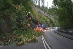 Die Nacht war noch nicht so richtig dem Morgen gewichen, als um kurz vor 6 Uhr eine Eiche samt Wurzeln aus dem Boden gerissen wurde. Die mächtige Krone krachte auf die Fahrbahn der B62. Der Stamm selbst kam oberhalb auf dem Steilhang zum Liegen. Die Straßenmeisterei Betzdorf und der Bauhof der Stadt Kirchen eilten an die Bundesstraße, einem Abschnitt zwischen Betzdorf und Kirchen. Äste, die in Fahrtrichtung Betzdorf die Straße blockierten, wurden kurzerhand mit der Motorsäge gekappt. Der Verkehr konnte so - wenn auch nur einspurig - weiter geleitet werden. Das regelten die Mitarbeiter der Straßenmeisterei, später zwei Beamte der Polizeiinspektion Betzdorf.