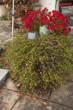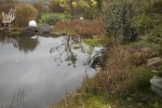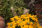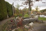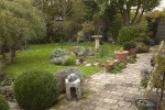 Die Bepflanzung ist so vielfältig angelegt, dass das ganze Jahr über Blüten zu sehen sind und den Insekten durchgängig Nahrung geboten wird. Jetzt im Herbst bleiben viele vertrocknete Pflanzen stehen, damit sie sich aussäen und auch den Kleinlebewesen eine Überwinterungsmöglichkeit bieten. Rasenflächen gibt es wenige. Die Hausherrin ist eine Katzenliebhaberin. Dies spiegelt sich im Garten wider. An vielen Stellen sind dekorative Steinkatzen platziert, die zum Beispiel unter Büschen hervorlugen. Weiter dienen alte Futtertröge als dekorative Elemente, neben vielen weiteren künstlerischen Gegenständen.