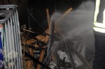 Die ersten Löschmaßnahmen zeigten schnell Wirkung und die Brandintensität ließ nach. Die Feuerwehr musste in mühevoller Arbeit den kompletten Bereich ausräumen. Angebrannten Teile wurden über zwei Fenster nach draußen befördert und unten mit Strahlrohren abgelöscht. Weitere Trupps unter Atemschutz öffneten die angebrachte Verkleidung, um an eventuelle Glutnester zu gelangen. Um Glutnester zu finden, wurden zwei Wärmebildkameras eingesetzt. Der rasche und professionelle Einsatz der freiwilligen Feuerwehren sorgte dafür, dass die Dacheindeckung kaum Schaden nahm.