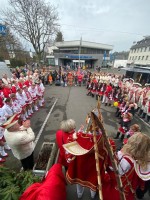 Jürgen Thielmann von der KG begrüßte das versammelte närrische Volk herzlich nach zwei Jahren voller Einschränkungen und Unsicherheiten in der Stadt Wissen – der Stadt "mit Zusammenhalt". Besonders angesichts der kürzlichen schlimmen Ereignisse mit dem Brand der Kreuzerhöhungskirche wolle man sich dennoch nicht den Spaß verderben lassen. Getreu dem Motto "Nicht mit uns" müssten alle Spaßverderber endlich begreifen, dass "wir zusammenstehen und lachen" und genau dieser Weg sei der Richtige. Auch Bürgermeister Berno Neuhoff verdeutlichte "die Wissener stohn, feiern und trauern zusammen", jetzt nach dem Brand und während des Krieges in der Ukraine. Auch eine Vielzahl der Ukrainer, die in Wissen eine neue Heimat gefunden haben, hatten sich vor dem Rathaus versammelt. Einen Dank richtete Neuhoff an die KG für die Organisation und wies schon auf den Höhepunkt des Veilchendienstagsumzuges hin.