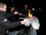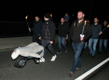 Auf der Brücke übergoss Robin Stricker, KG-Geschäftsführer und frisch gebackener Träger des städtischen Karnevalsordens, die Puppe mit Spiritus und zündete sie mit einer Fackel an. Diese fiel kopfüber ins Wasser und dürfte irgendwann in den Rhein gelangen. Auf dem Rückweg ins Vereinslokal klang der Spielmannszug dann wesentlich freundlicher. Und spätestens beim gemeinsamen Fischessen hatten die Karnevalisten zu ihrer guten Laune zurückgefunden. (PM)