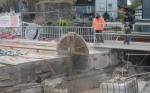 Das Sägeblatt der imposanten Wandsäge hat einen Durchmesser von 1,6 Metern. Zwei Exemplare davon schneiden sich durch die alte Hellerbrücke an Steinhaus Eck in Herdorf. Das sind Vorarbeiten, damit das alte Bauwerk aus dem Ortsbild im Städtchen verschwinden kann und so Platz für die Nachfolgerin macht.