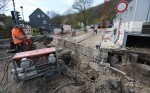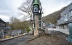 Bei den acht Schnitten entstehen sieben einzelne Elemente. Bevor ein Autokran die Teile an den Haken nimmt, müssen noch auf jeder Seite des einzelnen Balkens vier Kernbohrungen gesetzt werden, berichtet der Polier. Dann ist es eine Sache des Autokrans, die alte Konstruktion endgültig aus dem Stadtbild verschwinden zu lassen. Bevor es der Brücke selbst an den Kragen ging, war ein Bohrgerät auf Ketten angerückt. Wie schon die Wandsägen war auch der Bohrer eine imposante Erscheinung. Dieser hat einen Durchmesser von 90 Zentimetern. Erst wurde ein Bohrrohr in die Tiefe getrieben. Im Inneren des Rohres blieb Erd- und Felsmaterial stehen. Durch dieses hat sich der Riesenbohrer nach unten gearbeitet. Diese Bohrarbeiten waren erforderlich, um für die neue Brücke, die etwas größer als ihre Vorgängerin wird, die Pfahlgründung herzustellen. Auf beiden Seiten der Heller – das Bohrgerät wechselte über die alte Bücke die Seite - wurden jeweils drei Löcher mehr als achteinhalb Meter in die Tiefe gebohrt.