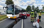Die verletzte Fahrerin wurde durch den Rettungsdienst versorgt und anschließend in ein Krankenhaus transportiert. Ebenfalls alarmierte First-Responder betreuten den unverletzten Busfahrer. Der Pkw wurde bei dem Unfall erheblich beschädigt und musste abgeschleppt werden. Der Bus war noch fahrbereit und konnte eine Werkstatt anfahren.