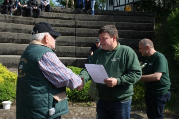 Leider konnte der erste Vorsitzende Frank Heuten beim diesjährigen Schützenfest in Maulsbach aus gesundheitlichen Gründen nicht alle anstehenden Ehrungen vornehmen. Dies nahm er dann zum Anlass, eine nicht alltägliche Ehrung im Rahmen der Vatertagswanderung an Christi Himmelfahrt im Anschluss an den Gottesdienst auf der Freilichtbühne in Mehren durchzuführen.