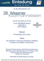 ANZEIGE | Die Wissener Aktionsgemeinschaft „Treffpunkt Wissen“ veranstaltet am 29. Juni das traditionelle Kaufmannsessen nun schon zum 28. Mal. Diesmal referiert Simon Sack zum Thema „Künstliche Intelligenz“ und wie diese in Unternehmen praktisch umgesetzt werden kann. Neu ist, dass an der Veranstaltung alle Interessierte teilnehmen können.