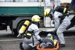 Bei der Erkundung erkannte der Einsatzleiter, Horhausens Wehrführer Thomas Schäfer, dass der Fahrer des Gabelstaplers bewusstlos in seinem Fahrzeug saß. Hier ging ein Trupp, ausgerüstet mit Schutzkleidung vor, um die Person zu retten und an den Rettungsdienst zu übergeben. Im weiteren Verlauf der Übung wurde durch den Gerätewagen Atem- und Strahlenschutz eine Atemschutzsammelstelle eingerichtet. Auch hier wurde auf eine strikte Schwarz- (benutztes Material) und Weiß-Trennung geachtet. Bevor Einsatzkräfte die Einsatzstelle verlassen durften, wurden sie durch die Kräfte der Dekontamination Gruppe "gereinigt". Die getragene Schutzkleidung wurde abgelegt und verpackt.