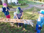 Eduardo und Michaela hatten bereits im Morgenkreis ihre Holzinstrumente mit einem Waldlied und Gitarrenbegleitung vorgestellt und so konnte nach der Holzsuche direkt die handwerkliche Umsetzung erfolgen. Schraubstöcke, Sägen, Hammer, Hobel, Bohrer wurden auf dem Gelände der Waldgruppe aufgebaut und die Kinder staunten mit großen Augen, als sie diese Geräte nutzen durften. Nach kleinen Einweisungen von Eduardo und Michaela war jedes Kind in seine Arbeit vertieft. Im Laufe des Vormittags verwandelten sich die Tothölzer in lebendige Skulpturen wie Schlangen, Hunde, Eulen, Pferde und überdies konnten die Kinder damit flöten, rasseln oder ratschen. Im gemeinsamen Schlusskreis wurden die ersten Instrumente vorgestellt und zum Lied "Die Affen rasen durch den Wald!" eingesetzt.