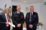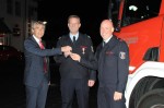 Es folgte die Verabschiedung des scheidenden Wehrleiters Heiko Grüttner. Bürgermeister Henrich ging darauf ein, dass das Vertrauen der Bürger in die Freiwillige Feuerwehr einer der Grundpfeiler dieses Ehrenamtes seien. "Es ist nicht selbstverständlich, dass Mitbürger unentgeltlich für das Wohl der anderen eintreten. Ich wurde bereits oft gefragt, ob denn unter den Einsatzkräften Freiwillige Feuerwehrleute seien. Diese Frage ist falsch herum gestellt – sie muss eigentlich lauten: Sind auch hauptamtliche Kräfte vor Ort? Wir verfügen, wie alle Gemeinden des Kreises, ausschließlich über Freiwillige Feuerwehrleute", so Henrich. Henrich stellte verschiedene Bereiche aus der langjährigen Führungsarbeit vor. "Deine Amtszeit als Wehrleiter erfolgte mit der in Dienststellung des TLF 4000 (Tanklöschfahrzeug) und endet heute mit der offiziellen Dienststellung der Drehleiter", führte Henrich weiter aus. Grüttner wurde, assistiert vom BKI, dann mit dem silbernen Feuerwehrehrenzeichen am Bande ausgezeichnet.
