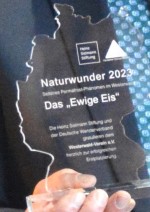 Thomas Bischoff von der Sielmann Stiftung hielt anschließend die Laudatio auf das "Ewige Eis" und den WWV. Er gratulierte und hob hervor, dass es dem WWV gelang, sich gegen stärkste Konkurrenz durch Mitbewerber relativ klar durchzusetzen. Anfangs hätte es nach einem Kopf-an-Kopf-Rennen ausgesehen, doch auf der Zielgeraden konnte sich der WWV klar absetzen. Bei der folgenden Überreichung des symbolischen Preises mit "Trophäe" und Urkunde an Landrat Schwickert und die Verantwortlichen des WWV gab es nur strahlende Gesichter.