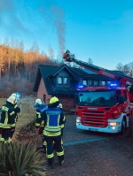 Doch auch der Sonntag (28. Januar) bot keine Gelegenheit zum Ausruhen. Um 15.45 Uhr alarmierte die Integrierte Leitstelle Montabaur die Feuerwehr zu einem Kaminbrand in Neuhöfchen bei Forst. Mit vier Fahrzeugen rückten die Wehrleute zur Einsatzstelle aus. Nach der Erkundung des HLF 20 konnte ein Kaminbrand bestätigt werden. Ein Feuerwehrmann versuchte, den Kamin von einem Korb der Drehleiter aus zu kehren. Glühende Reste wurden aus dem Keller entfernt und ins Freie gebracht. Nach rund einer Stunde wurde die Meldung "Feuer aus" gegeben.
