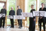 Marzinziks Kollege Daniel Diestelkamp stellte die Musizierenden vor: Jonas Gerigk am Kontrabass, Salome Amend am Marimbaphon und das Diaphonische Vokalensemble (Paola Gronau, Dorothé R. Marzinzik, Lothar Berger, Michael Hohenkamp und Daniel Diestelkamp).