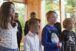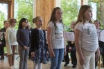 Das gebetsartige Mantra "Je voulais te dire - Ich möchte dir noch sagen" brachte die Stimmvolumina und begleitenden Instrumentalklänge von Kontrabass und Marimba eindrucksvoll zu Gehör. Die von Diestelkamp versprochene Überraschung am Ende des Programms kam in Form einer zwölfköpfigen Kindergruppe auf Socken hinzu: Der KuBiLand-Projektchor der Grundschule Mosaik Borod demonstrierte souverän seine Sangeskunst. Anni, Elin, Emily, Joleené, Lisa, Mathilda, Merle, Mia, Moritz, Noah, Paul und Friedegard Diestelkamp erhielten zum Dank kleine Topfpflanzen, die die Zeit überleben.