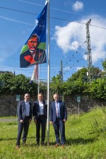 An der Volkshochschule Neuwied hissten die Bankvorstände Dr. Ralf Kölbach (Westerwald Bank), Matthias Herfurth (VR Bank RheinAhrEifel) und Oberbürgermeister Jan Einig gemeinsam die erste Fahne als sichtbares Zeichen. Weitere Fahnen werden an der Stadtverwaltung und am Bahnhof wehen. "Wir wollen keinen Personenkult um Friedrich-Wilhelm-Raiffeisen machen, uns geht es vielmehr um seine Genossenschaftsidee, die heute moderner denn je ist und immer mehr junge Anhänger findet", sagte Dr. Kölbach, der gleichzeitig Vorsitzender der Raiffeisen-Gesellschaft ist.