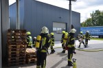 Die Feuerwehr Norken unterstützte zum einen den Innenangriff durch Personal mit Atemschutzgeräten und übernahm den zweiten Einsatzabschnitt auf der linken Seite des Gebäudes. Dort galt es mit einer Steckleiter ein verschlossenes Tor zu überwinden und dann erste Löscharbeiten im Außenbereich durchzuführen. Des Weiteren musste ein simulierter Flüssiggastank gekühlt werden.