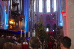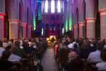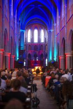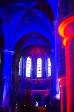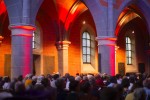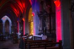 Streithausen. Brandt sagte in seiner Begrüßung, Licht verändere und tauche den Raum in verschiedene Farben, sodass er ganz intensiv und auf berührende Weise wirke. Tatsächlich ließ das Licht die Pfeiler der in ihrer schlichten Ausstattung ohnedies eindrucksvollen gotischen Zisterzienserkirche noch höher aufstreben. Die zwischen Zinnoberrot, Magenta, Blau und Grün wechselnden Strahler erzeugten, passend zur Musik, ein feierliches Ambiente. Mit zunehmender Dunkelheit von außen versanken die Zuhörer immer mehr im Dunkel des Kirchenschiffs, und das optische und akustische Erlebnis intensivierte sich. Frater Gregor Brandts Worte erfüllten sich, dass das Licht des lebendigen Gottes in den Menschen gehe und ihn in neuem Licht erscheinen lasse, trotz aller Dunkelheiten und in allen Dunkelheiten.